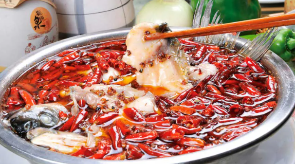 '수안차이유'라는 용어는 겨자나물 절임으로 뜨겁고 시큼한 생선을 뜻하는 말이다. 통째로 풀카프나 메기를 얇게 썰어 닭육수, 어육수, 쓰촨요리의 주재료이자 기본인 '시촨 피클'로 만든 풍성한 육수에 담근 클래식한 요리다. 절인 야채는 원래 야채가 없을 때 준비되었다. 옛날에는 가난한 가정의 주메뉴였다. 오늘날에는 보통 전채나 재료로 사용된다. 고추 못 먹으면 식당에 알려주면 음식에서 빼준다.