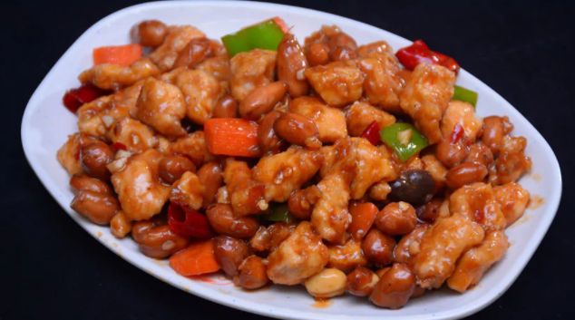 또 다른 쓰촨 고전인 이 요리는 서양인들에게 인기가 있으며, 다진 닭고기, 땅콩, 야채, 고추로 만들어진다. 이 요리는 청나라 말기 쓰촨성 총독 딩바오전의 이름을 따서 지은 것으로 추정된다. 그는 종종 그의 주방장에게 치킨, 땅콩, 부추, 고추 등을 포함한 요리를 해달라고 부탁했다. 자비로운 공무원인 딩은 민생을 향상시키기 위해 매우 열심히 일했다. 그의 사후 청나라 정부는 그의 업적에 경의를 표하여 그에게 '타이지 사오바오'(太子少, "왕자의 스승")라는 명예 칭호를 주었는데, 단식으로는 공바오(또는 쿵빠오)로 알려져 있었다. 그래서 쿵파오 치킨의 이름이다.
