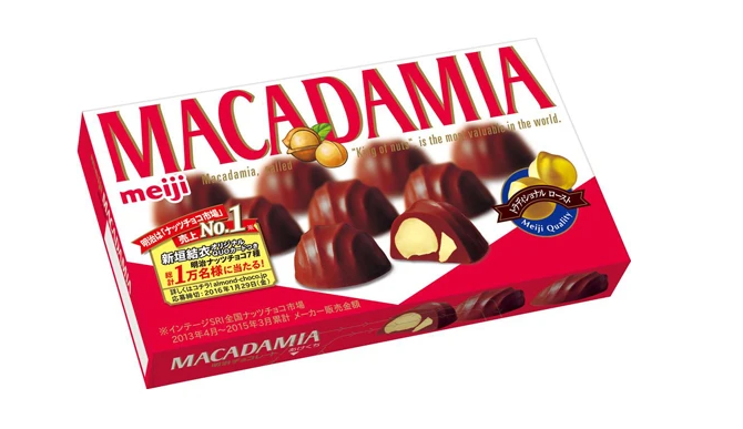 메이지 마카다미아는 마카다미아 견과류를 덮은 일본의 유명한 초콜릿으로, 보통 한 박스에 10개씩 들어 있습니다. 견과류의 바삭바삭한 소리가 이어지는 것은 단맛의 완벽한 양일 뿐입니다.