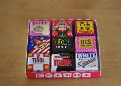 티롤은 개별 포장된 일본 초콜릿 스퀘어 라인으로 수십 년 넘게 일본 편의점에서 개별적으로 판매되고 있습니다. 종종 매우 싸서 쓸 동전이 거의 없는 아이들 사이에서 꽤 인기가 있습니다. 초콜릿에는 견과류, 크림, 젤리, 모치, 쿠키, 카라멜, 과일 등 다양한 속재료가 포함되어 있습니다.