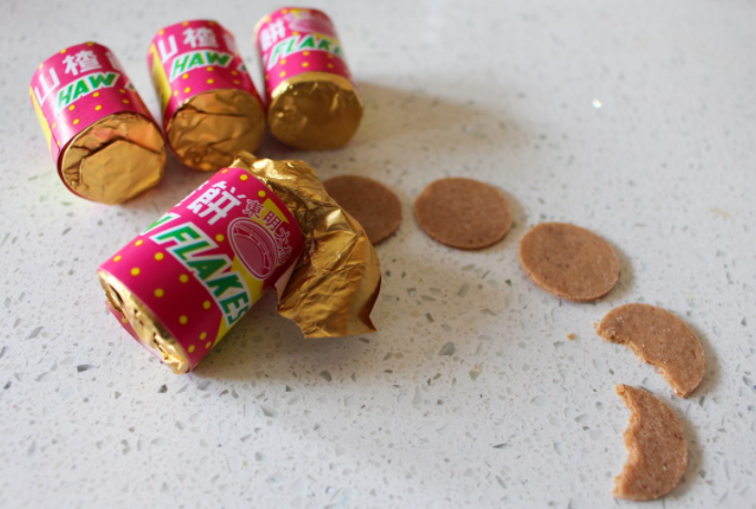호프 플레이크는 크랜베리처럼 생겼고 맛도 좋은 중국 산사나무로 만들어졌다. 이 호박은 동그라미를 치면서 단맛이 난다. 그것들은 달콤하고 약간 시큼한 균형이며, 한 통의 Lifesavers와 비슷하게 스택으로 빽빽하게 들어차 있다. 옛날에는 이 조각들이 강렬한 빨간색이었는데, 그 안에 있는 인공 색소를 줄인 것 같다. 호플라케스는 중국 폭죽을 연상케 하는 밝은 색상의 포장에 싸여 있다.